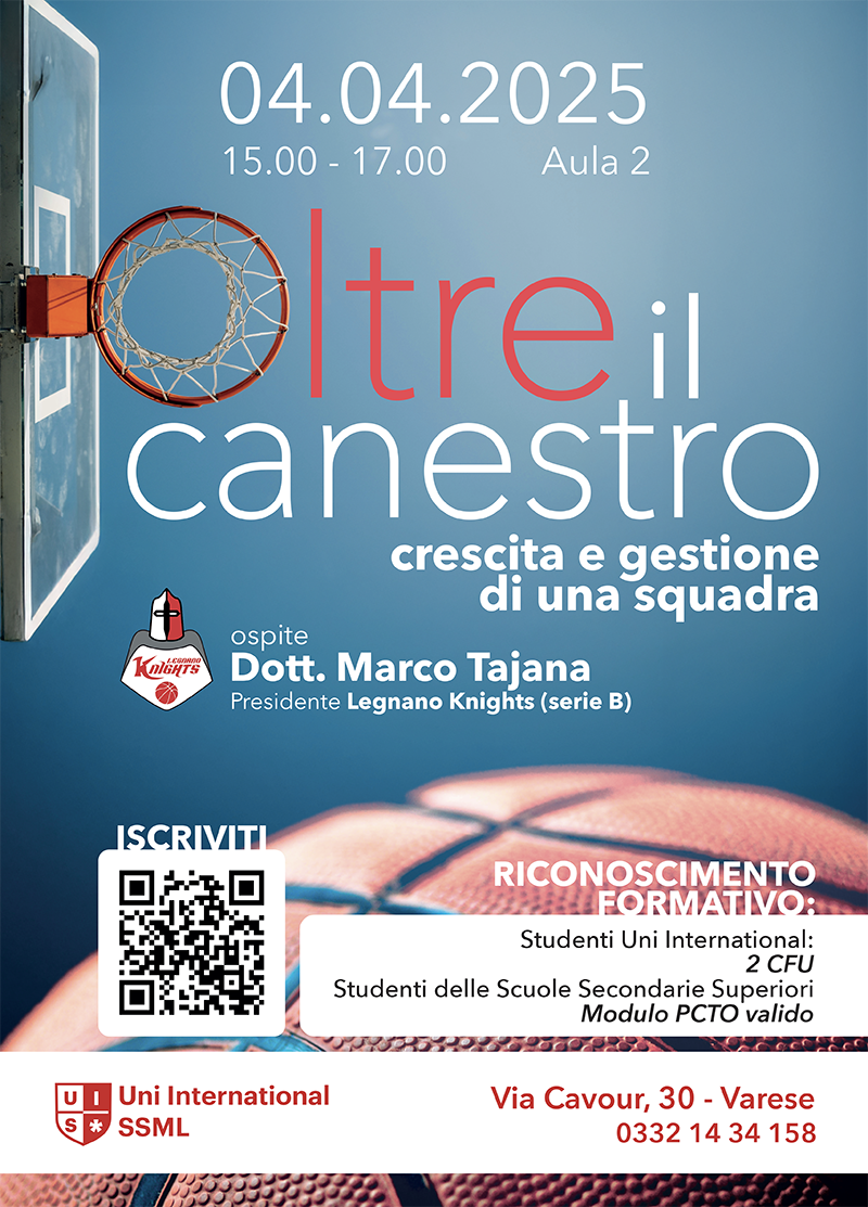 Il presidente dei Knights, Marco Tajana, terrà una lezione alla Uni International SSML di via Cavour, 30 a Varese, in cui parlerà dell'organizzazione e della gestione societaria del Legnano Basket.